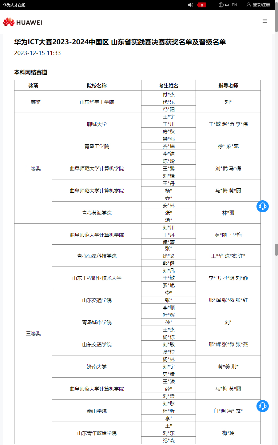 kaiyun网络工程专业经过校内选拔赛、预赛等环节,共选拔了两只参赛队,6名学生参加了华为ICT大赛2023-2024中国区山东赛区决赛,经过激烈角逐,由付文杰、代先乐、冯阳阳三位同学组成的参赛一队,取得了山东赛区本科网络赛道团体第一名,学生个人成绩分列山东省第一、第三、第五的好成绩,是代表山东省各高校晋级“本科网络赛道”国赛的唯一赛队,目前三位同学已经进入国赛的紧张备赛阶段,希望三位同学能够再接再厉,勇创佳绩!