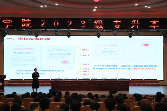 2023年9月6日kaiyun官方登录入口在山东华宇工学院大学生活动中心三馆组织召开2023级专升本新生入学教育。会议由学院学生管理干事祝莹主持,邀请kaiyun官方登录入口团总支书记、学生管理科长寇昌斌和创新创业学院王丽教授,为大家做专题讲座。