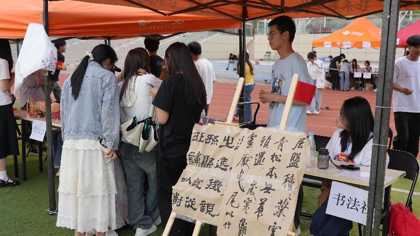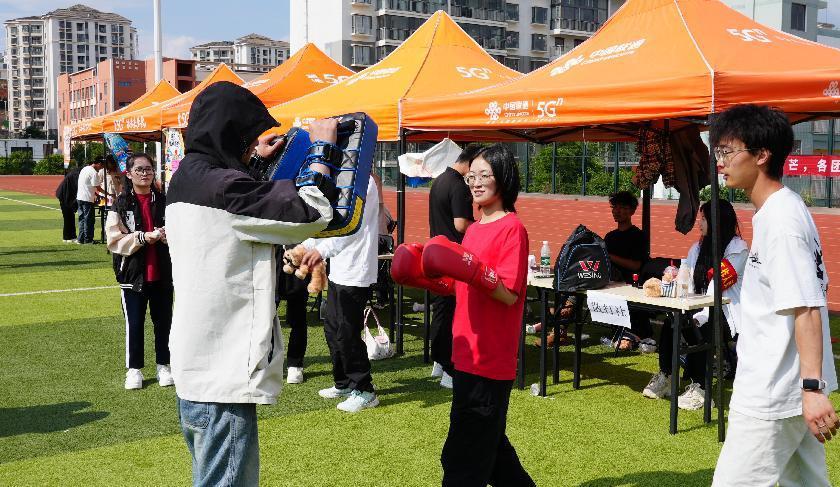 游园会现场人气爆棚,各类趣味活动精彩纷呈、亮点频出。知识问答区,同学们围聚,面对书法知识题,或蹙眉思索,或自信抢答,在汉字起源、名家、字体演变等知识碰撞中,尽显对传统文化的热忱;投壶游戏处,大家站定身姿,手持箭矢,屏气凝神投出,在传统游戏里体会古人雅趣,考验手眼协调;“摸石头过河” 游戏现场,参与者小心翼翼挪动 “石头” 前进,过程中状况不断,引得周围同学笑声连连,既锻炼了平衡能力,又充满挑战乐趣;拳击体验游戏更是活力四射,同学们戴上拳击手套,模拟对战,在挥拳与躲避间释放激情,感受运动魅力。丰富多样的活动让整个校园沉浸在欢乐与活力之中。同学们踊跃参与,欢声笑语不断,在轻松愉悦的氛围中感受社团文化的独特魅力。