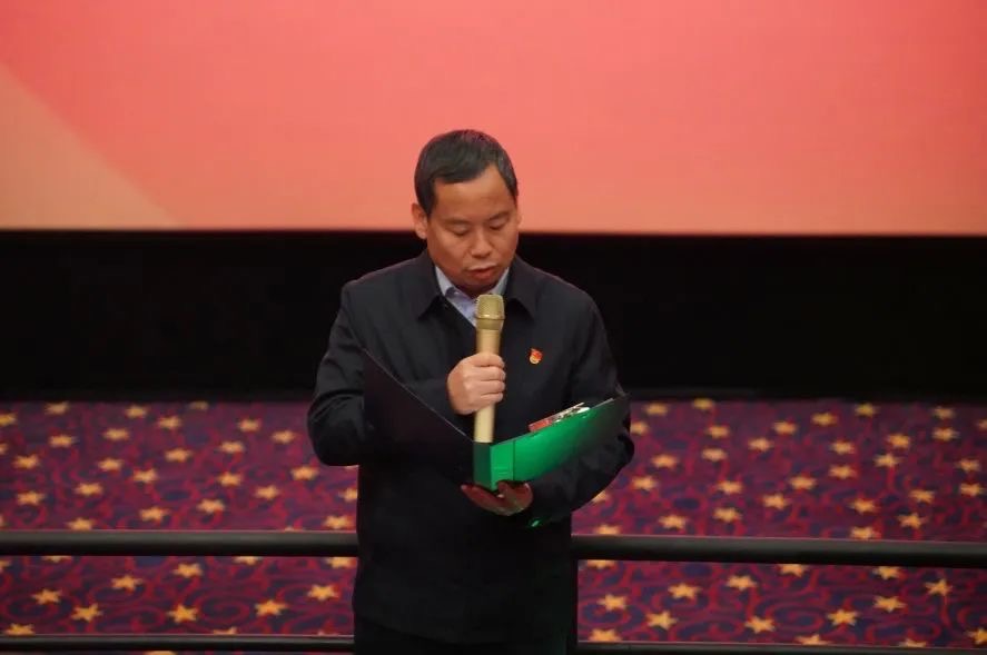 观看电影前,党委书记朱发刚为师生党员讲专题党课。