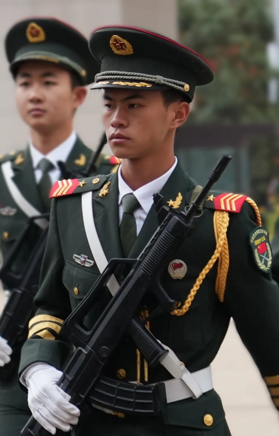 在晨曦中,国旗护卫队成员身着礼服,迈着整齐的步伐,护送国旗至旗杆前。他们身姿挺拔,眼神坚毅,展现作为青年良好的精神风貌。全体在场同学保持肃穆,以立正姿态对缓缓而来国旗行注目礼。